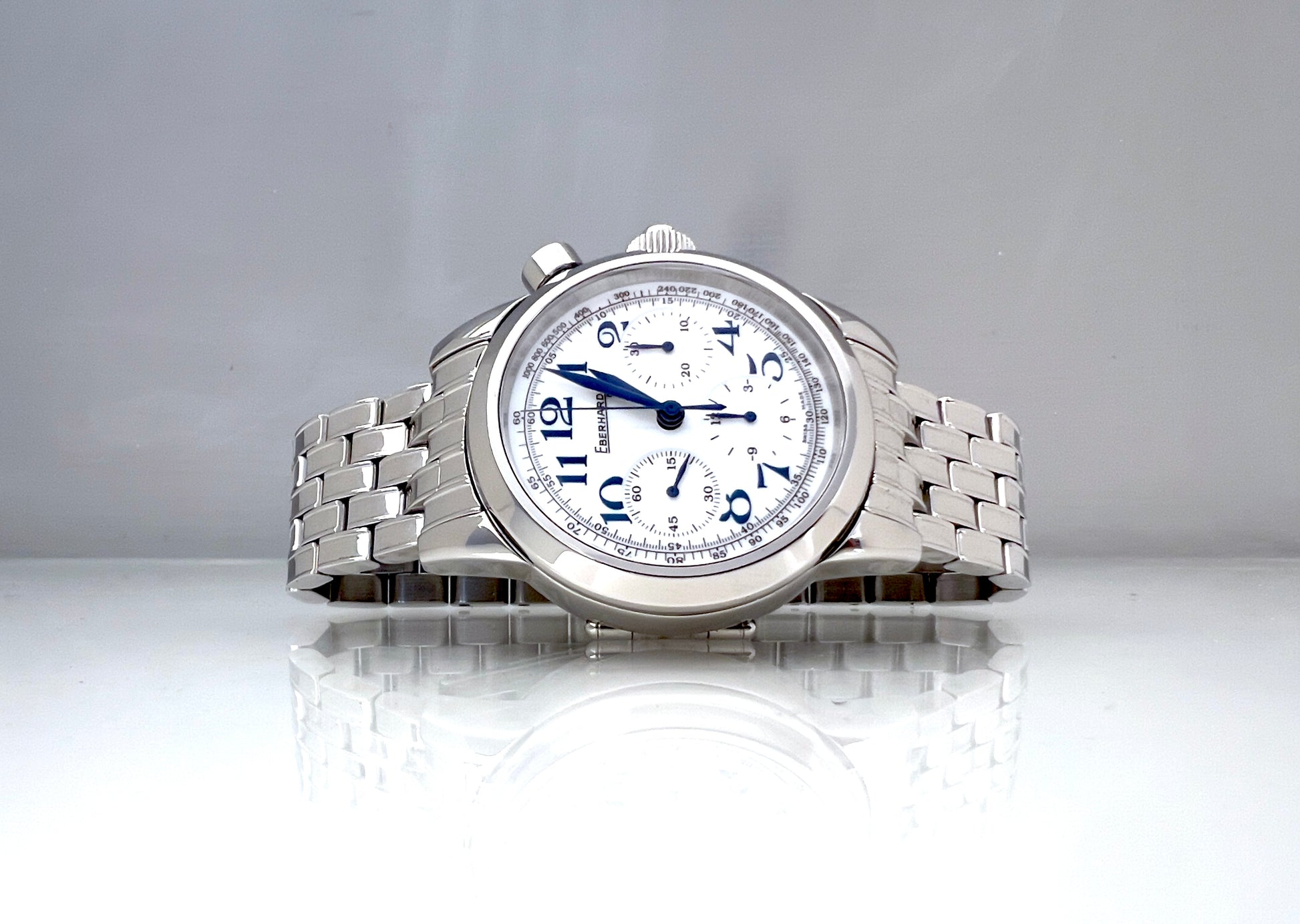 Like new watch, ref. 31045, 42mm, blue index, original steel bracelet. Our wood box, no paper.